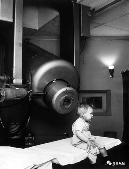 ↑1957年第一位接受采用線性加速器的放射療法治療視網膜母細胞瘤的患兒。他的右眼由于癌細胞擴散摘除,左眼經過治療后至今視力完好。 來源:National Cancer Institute