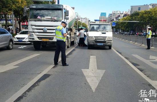 事故現場,交警已將肇事水泥罐車司機控制,并聯系老人家屬到場進行處理。