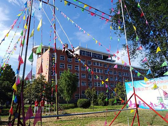9月7日上午,設在鄭州工程技術學院校內的分賽場上,作為此次運動會上一項重要項目的秋千比賽正在激烈進行中,在高達12米的秋千架下,運動員運用自身的力量將秋千蕩到近7米高。