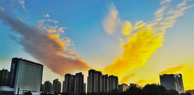 昨日,鄭州新地標(biāo)“三件套” 記者 馬健 圖9月6日晚,鄭州人抬頭看天,眼中是一片絢麗晚霞的彩衣,就連平日里潔白的云朵也變得火一般的鮮紅,造型更是如展翅的“火鳥”幾乎渲染了半邊天。