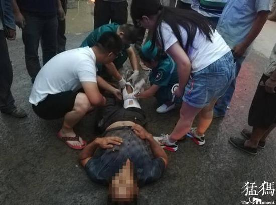 約十多分鐘后,急救車趕到,醫生初步判斷可能是腿部骨折,其它傷勢暫無法確定,隨后男子雙腿被裹上護板,在巡防員幫助下,本已擁堵不堪的馬路被騰出一條生命通道協助120將男子送往醫院搶救。