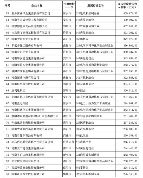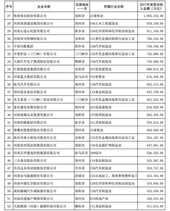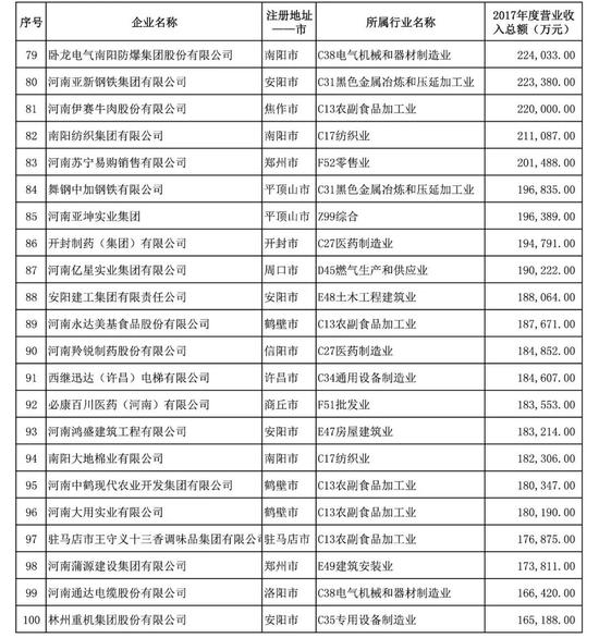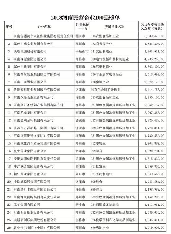 2018河南民營企業(yè)100強入圍門檻達(dá)16.52億元,較上年增加2.21億元。質(zhì)量效益穩(wěn)步提高,大型企業(yè)數(shù)量繼續(xù)增加,27家企業(yè)營業(yè)收入突破100億元,較上年增加了7家。納稅總額超過1億元的企業(yè)有69家,較2016年增加了8家,其中,有8家企業(yè)納稅總額突破10億元,比2016年增加了1家。河南省漯河市雙匯實業(yè)集團有限責(zé)任公司、鄭州中瑞實業(yè)集團有限公司、天瑞集團股份有限公司、河南森源集團有限公司、鄭州宇通集團有限公司、河南黃河實業(yè)集團股份有限公司、河南正商置業(yè)有限公司、洛陽欒川鉬業(yè)集團股份有限公司、河南眾品食業(yè)股份有限公司、河南金匯不銹鋼產(chǎn)業(yè)集團有限公司位列榜單位前10名。