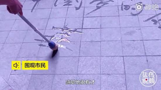 10月1日晚,文化路與英才街一商場外人頭攢動,他們在圍觀什么?記者擠進人群看到,一位老先生正在用自制的“大毛筆”在地上寫書法,筆酣墨飽,字跡蒼勁有力。地書部分內容為:“華夏騰飛”、“向著中國夢的康莊大道前進”字里行間透出對祖國滿滿的祝福。