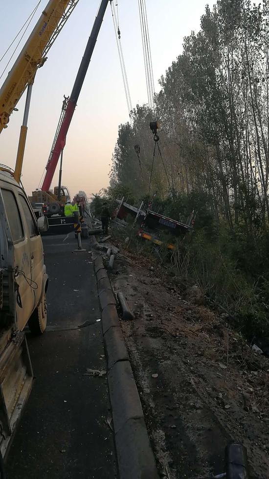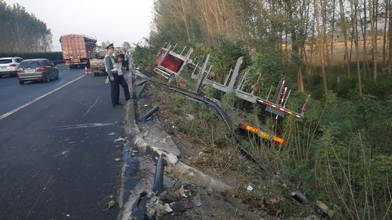 10月4日16時20分,正在蘭南高速巡邏的許昌高速交警二大隊民警孫廣濤、郝躍軍接到指揮中心指令,蘭南高速平頂山至許昌方向K158公里處發生一起大貨車沖出隔離護欄側翻在道路邊溝的交通事故。
