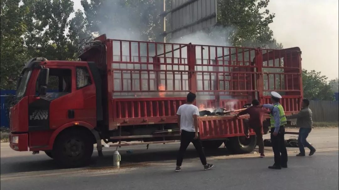 10月9日下午15點30分,周口交警支隊直屬一大隊中隊長王杰光帶領民警正常巡邏。當巡邏至周西路口時,發現對向車道內一輛貨車在行駛中有異常情況,車輛上方冒起滾滾黑煙。