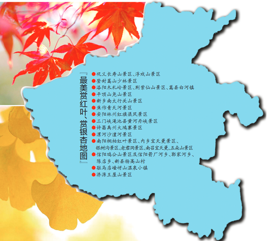 本報訊(記者 成燕 文/圖)秋天是色彩斑斕的季節。隨著氣溫持續下降,河南境內太行山、伏牛山、大別山三大山系層林盡染、漫山披紅,目前河南多地彩葉樹已逐漸進入最佳觀賞季。為方便群眾秋游,省旅游局昨日推出“最美賞紅葉、賞銀杏地圖”,包括26家景區。