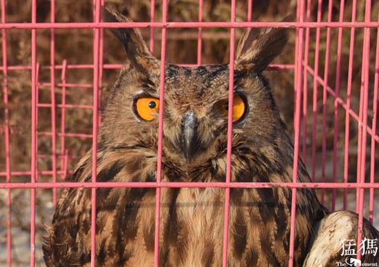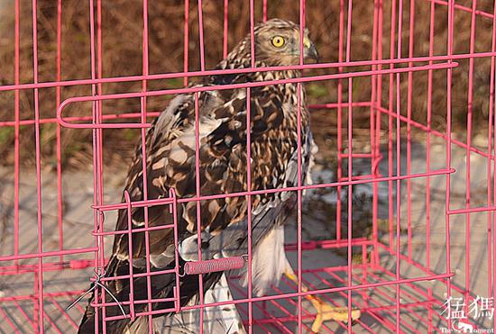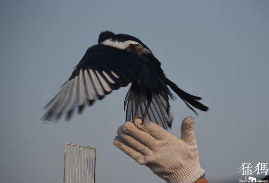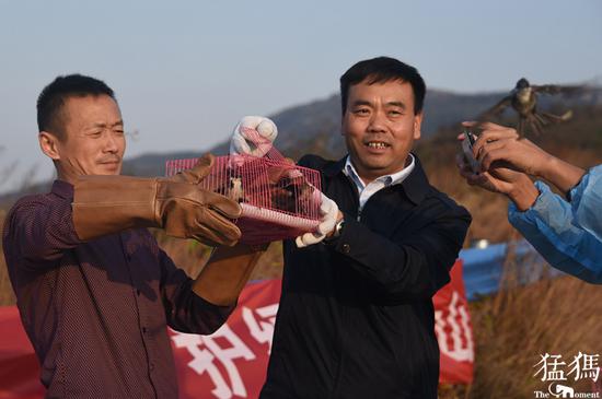 放飛猛禽時,工作人員格外謹慎,即便如此,帶著手套的救護站站長董朝偉手指還是被白腹鷂利爪抓傷。