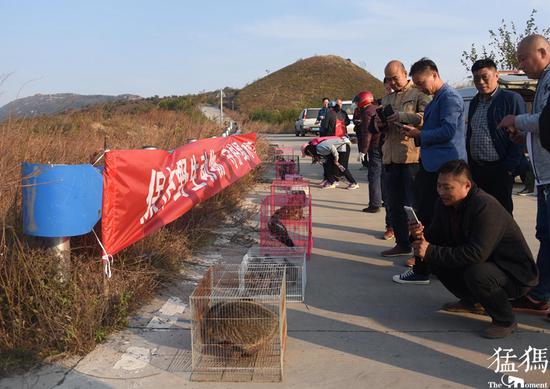 當日下午,130多只野生動物,在新鄭市救護分站專車護送下到達新鄭具茨山,大家把一個個裝著野生動物的鐵籠子輕輕放下,碼放在路邊,籠子里的鳥兒有些急不可待要出籠,躍躍欲試,翅膀猛拍這鐵籠子,果子貍則在籠子里不斷轉圈,顯得異常興奮。