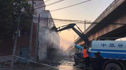 11月11日上午10時許,記者看到,在西流湖辦事處鄭西高鐵南、長椿路西側有多處違建緊鄰高鐵,兩輛工程車在除塵車的配合下正在進行拆除;與此同時,在隴海鐵路和西三環交匯處路南側,工程車正在對沿鐵路邊的幾間已經倒塌的簡易房進行清除。