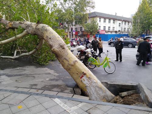 11月11日上午9時20分左右,文化路紅旗路交叉口西南角,因為地下一熱力管道爆裂導致泥土掏空,一棵碩大的法桐樹轟然倒下,在路口等信號燈的一名老者腳踝被砸中。