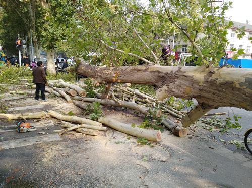 上午9點40分,記者在事發現場看到,路口西南角倒下的法桐樹枝繁葉茂,樹身由南向北將紅旗路擋得嚴嚴實實,經由紅旗路的公交車不得不改道行駛,一些騎電動車的市民則在經八路巡防隊員的幫助下,從樹枝的縫隙中謹慎穿行。