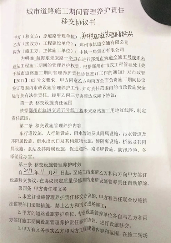記者從這份2017年11月份三方簽署的協(xié)議書中看到,關(guān)于鄭州市軌道交通5號線航海東路未來路十字口地鐵施工期間的管理養(yǎng)護權(quán)責(zé),甲方(鄭州市市政工程管理養(yǎng)護所)同意乙方(鄭州市軌道交通有限公司)和丙方(中鐵一局集團有限公司)全面負(fù)責(zé)施工期間設(shè)施安全運行,負(fù)有法律責(zé)任。