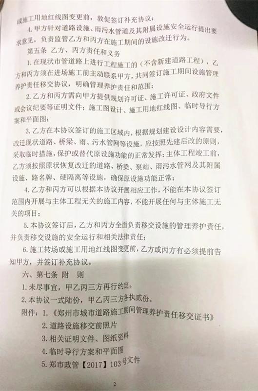 稿件發(fā)布后,關(guān)于稿件中鄭州市軌道交通工程三員中的監(jiān)督員劉夢飛所說的內(nèi)容,鄭州市市政工程管理處第一時間向猛犸新聞?東方今報作出回復(fù),表示對方說法不實,并出示了一份《城市道路施工期間管理養(yǎng)護責(zé)任移交協(xié)議書》(下稱協(xié)議書)。