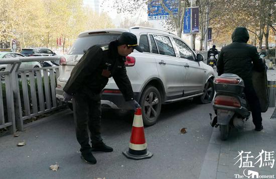 現(xiàn)場,越野車占據(jù)了大部分路面,只留下一米多的空隙,由于兩只前輪剛好卡在兩柱子之間,嚴重影響著慢車道通行,未來路巡防員趕到后只好臨時放置了警示錐,提醒路人繞行。