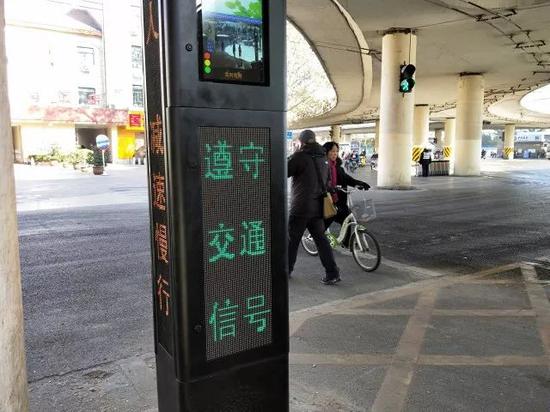 除此之外,之所以叫抓拍神器,也是另有原因的,記者注意到,在每根信號燈燈箱的頂部,都裝有一個高清攝像頭,而在它的下方是兩塊電子顯示屏,一塊顯示違章行人的面部信息,一塊顯示被抓拍者的違章細節,這對于走斑馬線過路口的行人來說,無疑更加能夠規范大家的行為。