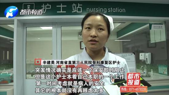記者在醫院了解到,追趕這位男子的護士,就是骨科二病區的辛建美。當時,這名男子發瘋似的從住院部12樓跑到8樓,危險的一幕眼看就要發生了。