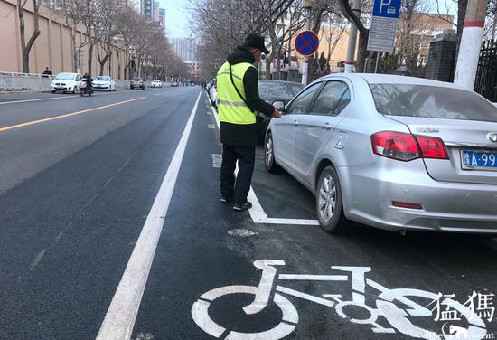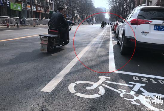 “你看看,自行車(chē)道被新劃的停車(chē)位占住了,路邊沒(méi)有停車(chē)還好,一旦有汽車(chē),我騎車(chē)只能走快車(chē)道,基本沒(méi)有騎車(chē)的位置了。”市民張先生說(shuō),“這里最多能容下一輛電動(dòng)車(chē)通行,不走機(jī)動(dòng)車(chē)道你說(shuō)走哪?”