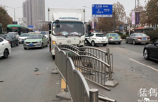 12月25日下午14時許,鄭州市花園路與天倫路附近快車道,一輛越野車司機由于操作不當,撞上一輛同向行駛的廂式貨車后導致貨車失控,撞毀路中約30米不銹鋼隔離欄。