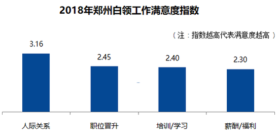 此次報告的工作滿意度指標包含薪酬福利、培訓學習、職位晉升和人際關系四個方面。整體來看,2018年鄭州白領工作滿意度指數為2.58,相較于去年的2.57有小幅度的上升。但在全國范圍內,指數排在第31位,比較靠后。分指標來看,2018年鄭州白領薪酬利狀況滿意度排名最低,滿意度指數僅為2.30;對職場人際關系滿意度最高,滿意度指數為3.16。