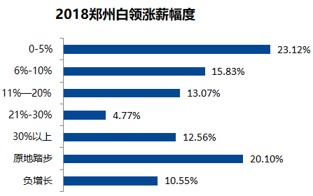 值得注意的是,2018年近七成鄭州白領實現不同程度的漲薪,漲薪幅度在“0-5%”的最多,達23.12%;增長“30%以上”的占比12.56%。整體來看,鄭州白領在過去一年漲薪幅度雖并不振奮人心,但基本是在平穩小幅上漲。