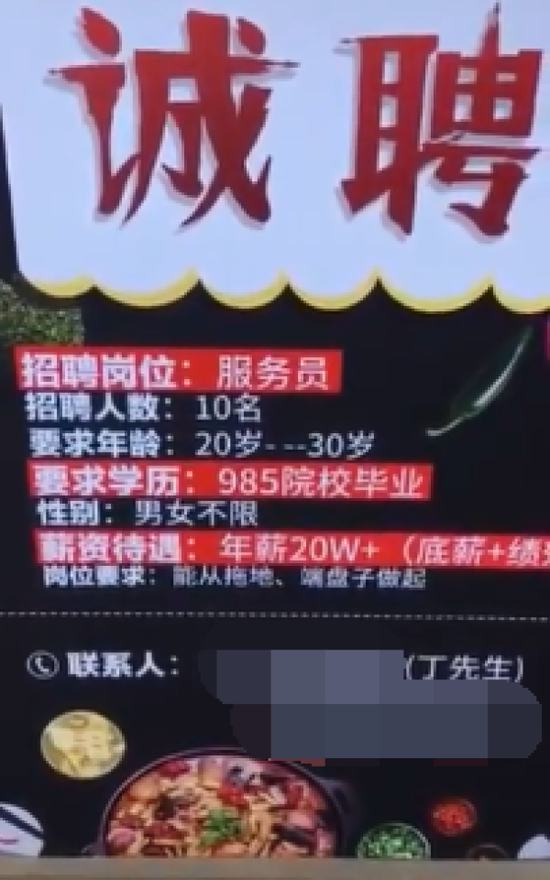映象網(wǎng)訊(記者 劉磊)說起招聘服務(wù)員,大家都不陌生,一些國企、外企招聘名校畢業(yè)生,大家也并不稀奇。但你見過火鍋店招聘服務(wù)員,要求學(xué)歷必須是985院校的嗎?