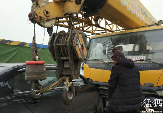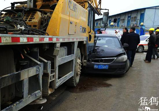 事故現場,一輛黑色轎車車頭右前方鉆進一輛大吊車的保險杠下,地上滿是流淌的機油和被撞碎的車體碎片,吊車的大鐵鉤垂懸在轎車右后方車窗玻璃處。