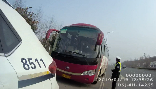 1月13日12時38分,鄭州交警六大隊民警劉德權駕駛警車,在鄭開大道由東向西行駛至賀莊路口停在直行道等紅燈,就在這時,一輛車牌號為魯RH2359的大型普通客車,在鄭開大道賀莊路口東向西左轉道,絲毫沒有減速,直接從左轉道沖了出去,闖紅燈直行通過路口。