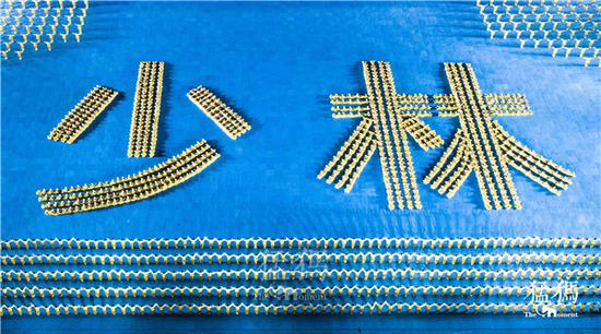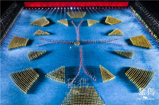 整齊劃一、氣勢磅礴的少林功夫表演,在音樂伴奏下,不斷變換出人塔、少林拳、八卦陣等造型,動如潮水、靜如磐石。數千名演員巧妙地組成的“春”和“福”字,營造出新春佳節的喜慶氛圍,6000多平方米的五星紅旗精彩亮相,祝福祖國日益昌盛、繁榮富強。