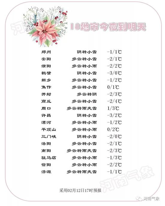 13日到14日白天,全省多云轉陰天,黃河以北和三門峽、洛陽、鄭州、平頂山、許昌五地區及開封、南陽、漯河三地區北部有小到中雪,局部大雪;淮河以南有小到中雨;其它地區雨夾雪或小雪。