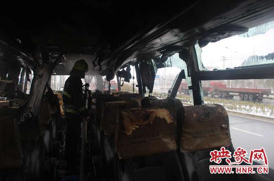 當天下午14時19分,消防指戰員趕到現場后發現,大巴車上火光沖天而起,火勢正處于猛烈燃燒階段,大巴車尾部火勢蔓延迅速,火苗濃煙較大。現場消防指揮員立即命令:出2支水槍出水滅火。待火勢得到控制后,利用消防斧破拆窗戶排煙,出1支水槍內攻救火,幫忙乘客取出為損壞行李,減少損失。下午15時15分。明火完全被撲滅。