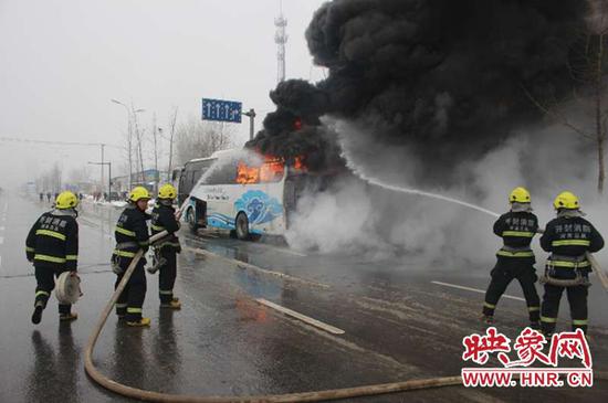 映象網開封訊(記者 崔學慶 通訊員 王芳) 2月15日下午,一輛從鄭州東站開往菏澤東明縣長興集鄉的客運大巴車,在途經開封市東京大道與第九大街交叉口附近時突然起火。緊急時刻,司機立即停車,疏散15名乘客安全撤離,隨后當地12名消防指戰員趕到現場,將正熊熊燃燒的大巴客車火災撲滅。