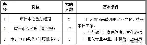 大河財立方消息 2月18日,河南能源發布公告,根據集團深化改革總體要求,以及改組國有資本投資公司實際需要,為打造一支高素質審計團隊,高質量地開展審計工作,結合集團審計中心的職責定位及定編定員情況,面向社會公開招聘內部審計人員20名。具體事宜如下: