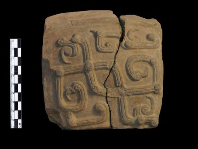 這是官莊遺址出土的連體龍鳳紋陶模,用于翻制陶范(新華社發)據介紹,遺址還發現了漢代磚瓦窯、鐵器窖藏和磚砌窖穴,出土鐵釜、鐵質高柄薰爐、犁鏵、鐵戟等較完整的鐵器,說明這里在漢代可能有冶鐵作坊。