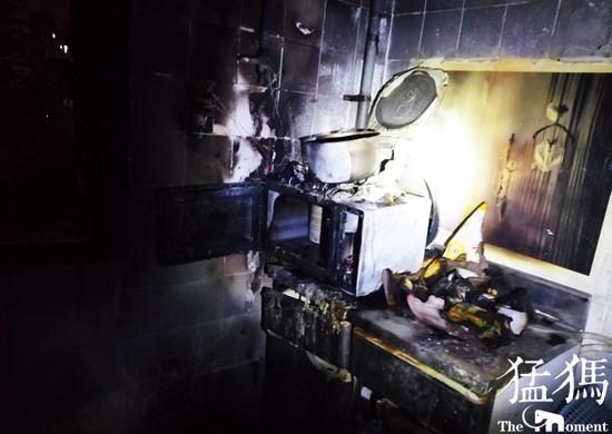 數分鐘后,消防員抵達現場強行將房門打開后將大火撲滅,三四平方米的廚房,已經被燒得焦黑一片,廚房窗戶玻璃被燒炸,燃氣灶、櫥柜、微波爐等家電均被燒報廢,而住宅內卻無人在家。