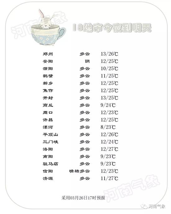 今天夜里到明天,西部、南部多云間陰天,其中南陽、信陽兩地區和三門峽、洛陽、駐馬店三地區南部部分地區有小雨或零星小雨;其它地區多云。