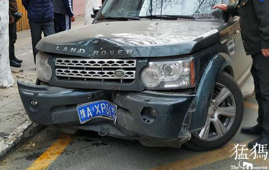 3月28日上午8時許,位于鄭州市豐樂路東風路北約30米路邊,一輛路虎車在撞壞路邊一輛寶馬轎車后,緊接著狠狠地撞上人行道一根粗大的水泥線桿,由于沖擊擊力很大,導致路虎車車頭明顯呈“V”字形。