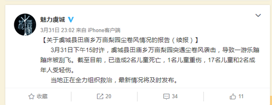 3月31日下午15時許,虞城縣田廟鄉(xiāng)萬畝梨園突遇塵卷風襲擊,導致一游樂蹦蹦床被刮飛。截至目前,已造成2名兒童死亡,1名兒童重傷,17名兒童和2名成年人受輕傷。
