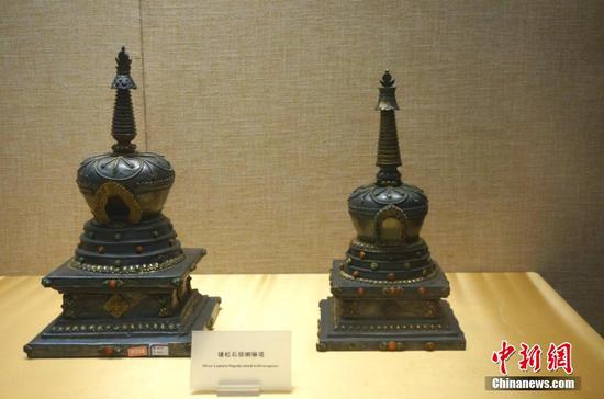 洛陽博物館藏、原藏北京故宮慈寧宮大佛堂的鑲松石銀喇嘛塔。韓章云 攝