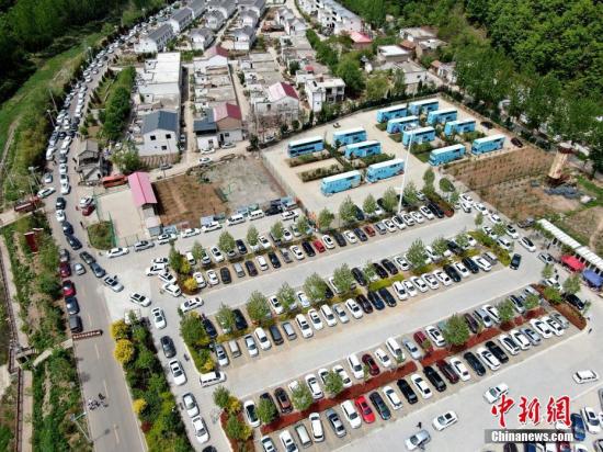 5月2日,五一小長假第二天,河南三門峽,游客擠爆豫西百草園,超大停車場密集排滿,馬路上繼續(xù)前來的車輛仍絡繹不絕,在馬路上排起長龍,變成停車場。圖為停車場幾欲飽和,馬路上的車輛仍然絡繹不絕。 王中舉 攝