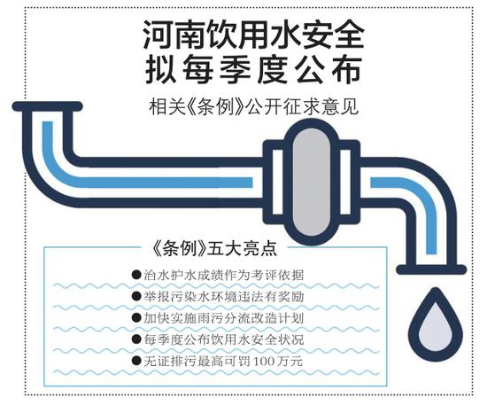 (記者 李娜)飲用水安全狀況信息每季度向社會(huì)公開(kāi)一次;無(wú)證排污最高可罰100萬(wàn)元……昨日,記者從省人大常委會(huì)獲悉,省人大常委會(huì)就《水污染防治法》執(zhí)行過(guò)程中有什么問(wèn)題、《河南省水污染防治條例(修訂草案)》是否完善等方面,公開(kāi)征求市民意見(jiàn)。