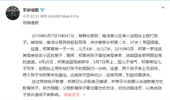2019年5月7日10時47分,有群眾報警:南灣某小區有人在陽臺上毆打孩子。接警后,南灣分局民警趕赴現場,將涉事家長鄭某(女,37歲)帶回調查。