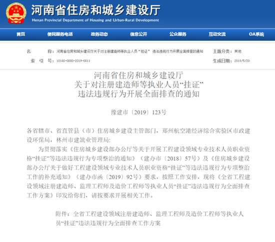 大河財立方消息 5月20日,河南省住房和城鄉建設廳官網發布《關于對注冊建造師等執業人員“掛證”違法違規行為開展全面排查的通知》。通知稱,自2019年5月至8月底全省工程建設領域注冊建造師、監理工程師及造價工程師等執業人員“掛證”違法違規行為專項整治工作進入全面排查階段。