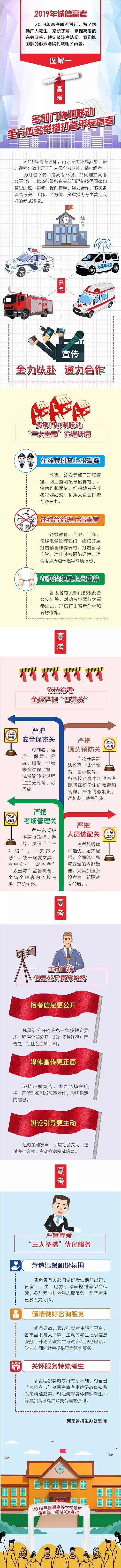今天,省招辦發出2019年誠信高考圖解一《多部門協調聯動 全方位多舉措打造平安高考》。據了解,今年考生入場繼續實行指紋、照片、身份證“三對照”,“無聲入場”,統一配發文具;考中實行“雙監考”“雙巡考”監督機制,全省全程聯網監控考場、嚴防作弊。