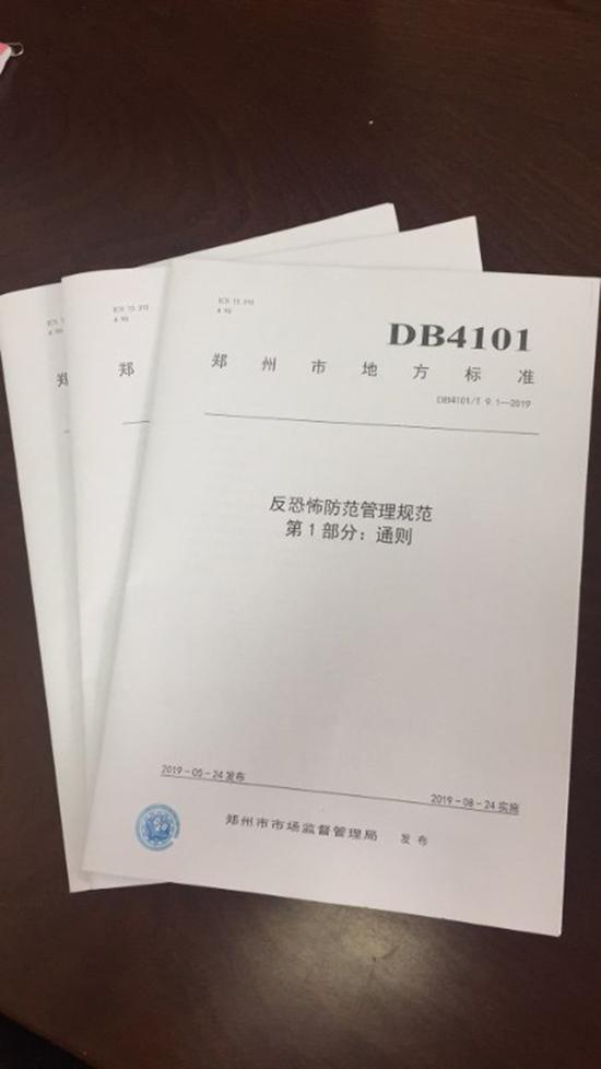 記者從2019年省會鄭州反恐怖工作會議上獲悉,鄭州市市場監(jiān)督管理局于5月24日向社會發(fā)布了鄭州市地方標(biāo)準(zhǔn)《反恐怖防范管理規(guī)范 第一部分:通則》(DB4101/T 9.1-2109)。該規(guī)范將于2019年8月24日正式實(shí)施。據(jù)悉,該規(guī)范填補(bǔ)了我省無反恐怖防范地方標(biāo)準(zhǔn)的空白。