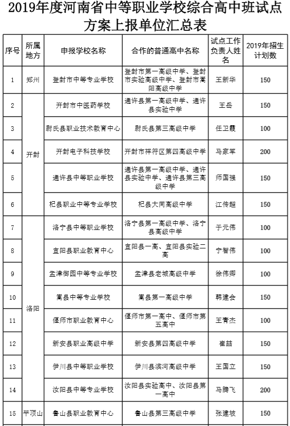 5月29日,記者從省教育廳獲悉,經各省轄市、省直管縣(市)教育局推薦,日前,我省擬確定登封市中等專業學校等80個單位為2019年河南省中等職業學校綜合高中班試點單位,面向社會公示,公示期截至6月2日。