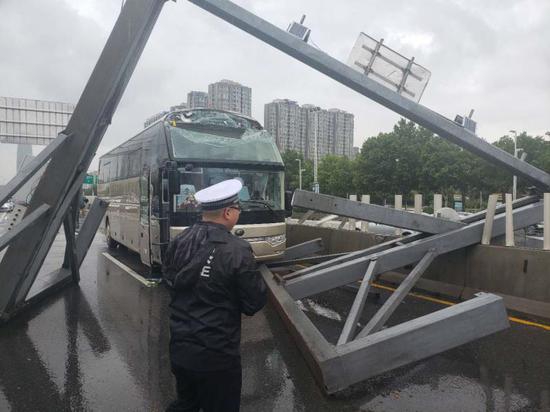 下了一夜雨的早上,一輛大巴車行駛在中州大道鄭汴立交橋由北向南上橋口時, Duang~~,不僅撞翻了限高桿,大巴車也撞到桿上被削了頭。