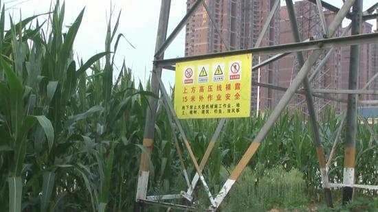 據巡防員查看稱,此處的高壓線塔架空電力線路為220千伏,塔下保護區至少在5米以外的距離。線塔下明確標注有,禁止堆土、植樹以及禁止停留等警示標志。可面對眼前這一片茂密的農作物還是令人為安全有所擔心。