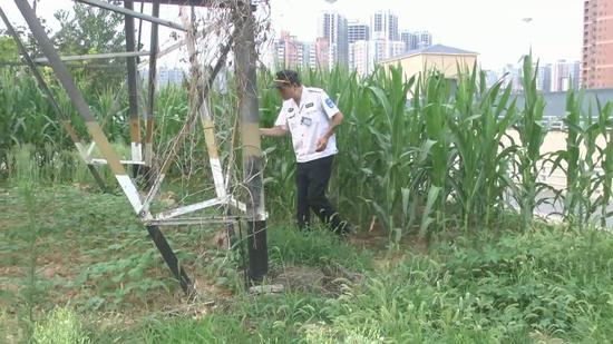 據隊員打聽得知,在高壓線塔基上開荒種植農作物的是住在附近一位60多歲的大媽,她經常會出現在塔基上,給種植的玉米和蔬菜松土澆水。