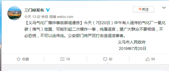 今天(7日20日)中午有人謠傳的氣化廠一氧化碳(煤氣)泄露、可能引起二次爆炸一事,純屬謠言,望廣大群眾不要相信,不必恐慌,不可以訛傳訛。公安部門將嚴厲打擊造謠滋事者。