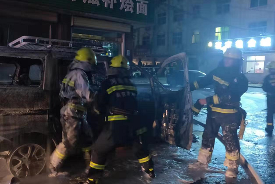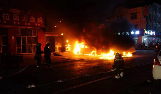22時(shí)46分,接到報(bào)警的鄭州航空港區(qū)消防救援支隊(duì)鄭港十一路中隊(duì)消防指戰(zhàn)員到達(dá)現(xiàn)場(chǎng),現(xiàn)場(chǎng)火苗沖天,著火汽車緊挨著多棟村民自建房屋,且房?jī)?nèi)居住近百名村民,部分自建房屋的墻面已被熏黑,門面房招牌已被燒毀。現(xiàn)場(chǎng)指揮員果斷下達(dá)救援指令:主戰(zhàn)消防車在火場(chǎng)的東西兩面單干線出兩支泡沫槍,阻止火勢(shì)蔓延;16噸水罐消防車向主戰(zhàn)消防車不間斷供水;警戒組劃定安全區(qū)禁止無(wú)關(guān)人員進(jìn)出;搜救組進(jìn)入自建房?jī)?nèi)由下至上進(jìn)行搜救,確保無(wú)人員受傷被困。命令下達(dá)后,各小組有序展開滅火救援。